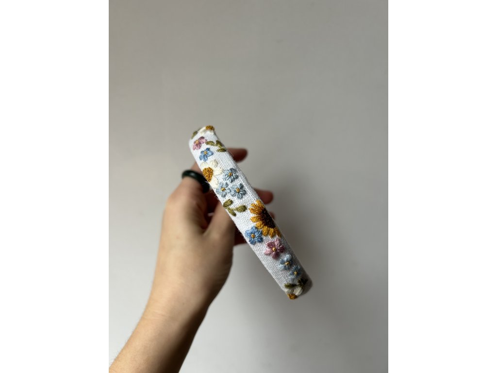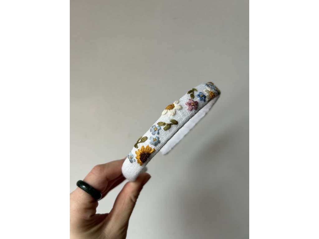 Tahle květinová čelenka dotáhne váš účes k dokonalosti. Vhodná pro malé, tak i velké. S bohatou květinovou luční výšivkou na bílém podkladu.